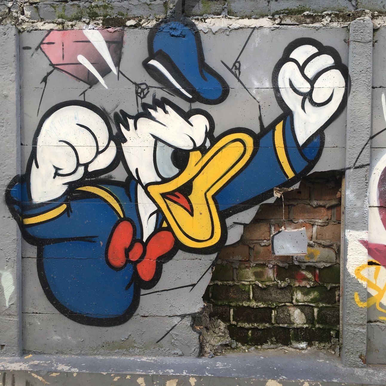 En cualquier caso, la imagen y la frase están sacadas de contexto. No sabemos a qué se refiere Bolaño con boxear, porque el box es una pelea, pero también es un deporte. ¿Una pelea Y un deporte? Tampoco sabemos qué le está pasando a Donald, si está enojado porque la pared se rompió, o si es su grito el que rompe la pared. ¿Pertenece la rotura del muro que sostiene la imagen a la imagen? Notemos que parte del graffiti son unas líneas que parecen representar rajaduras en el muro y, en la esquina superior izquierda, una representación pintada de lo que le sucede a la pared “realmente” en la esquina inferior derecha. Podemos imaginar que el muro estaba roto y alguien, artista sensible e inteligente, tuvo la idea de pintar a ese Donald justo ahí, agregando al dibujo las líneas de rajadura y los ladrillos de pared pelada. Como sea, si la rotura es parte de la obra, entonces nos podemos preguntar: ¿qué implicaría el que las dos cosas sean ciertas a la vez —Donald está enojado porque alguien rompió su pared, pero es su mismo grito el que rompe la pared? ¿Puede esa ambigüedad decirnos algo sobre la naturaleza de la reactividad humana?